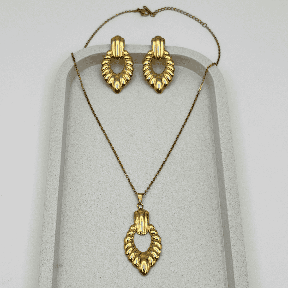 Enhance your look with this Textured Leaf Drop Golden Pendant & Earring Set, crafted from high-quality stainless steel for lasting beauty. The elegant design features leaf-like textured detailing that exudes sophistication and charm. Finished with anti-tarnish plating, this set maintains its radiant golden shine over time. Perfect for parties, weddings, festive occasions, or gifting, this set complements both traditional and modern outfits effortlessly.